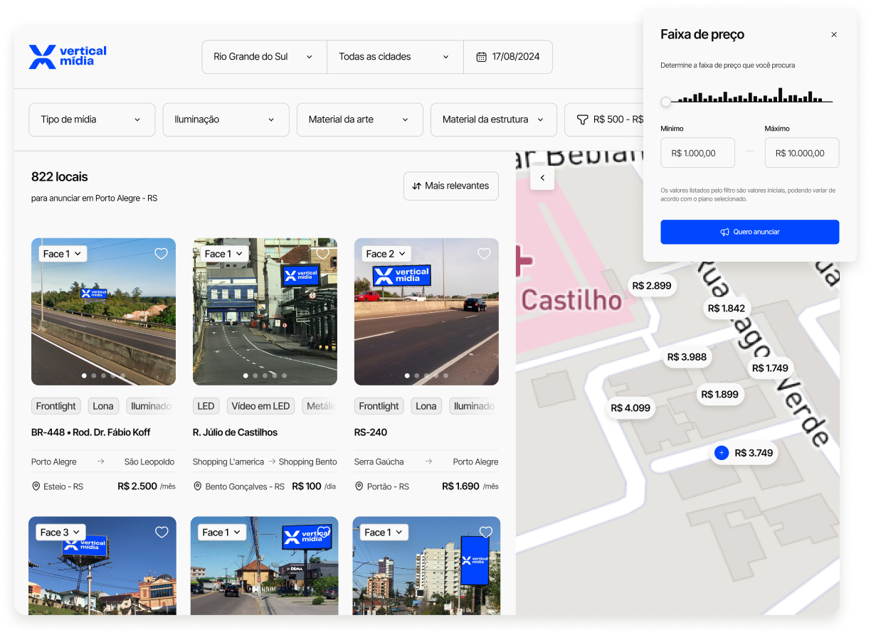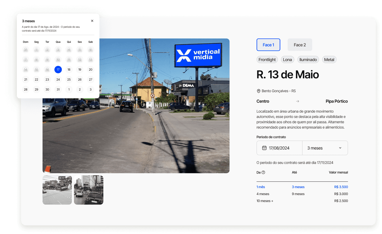 Depois de escolher o ponto ideal, personalize sua locação selecionando as opções de veiculação e serviços adicionais que melhor atendem às suas necessidades.