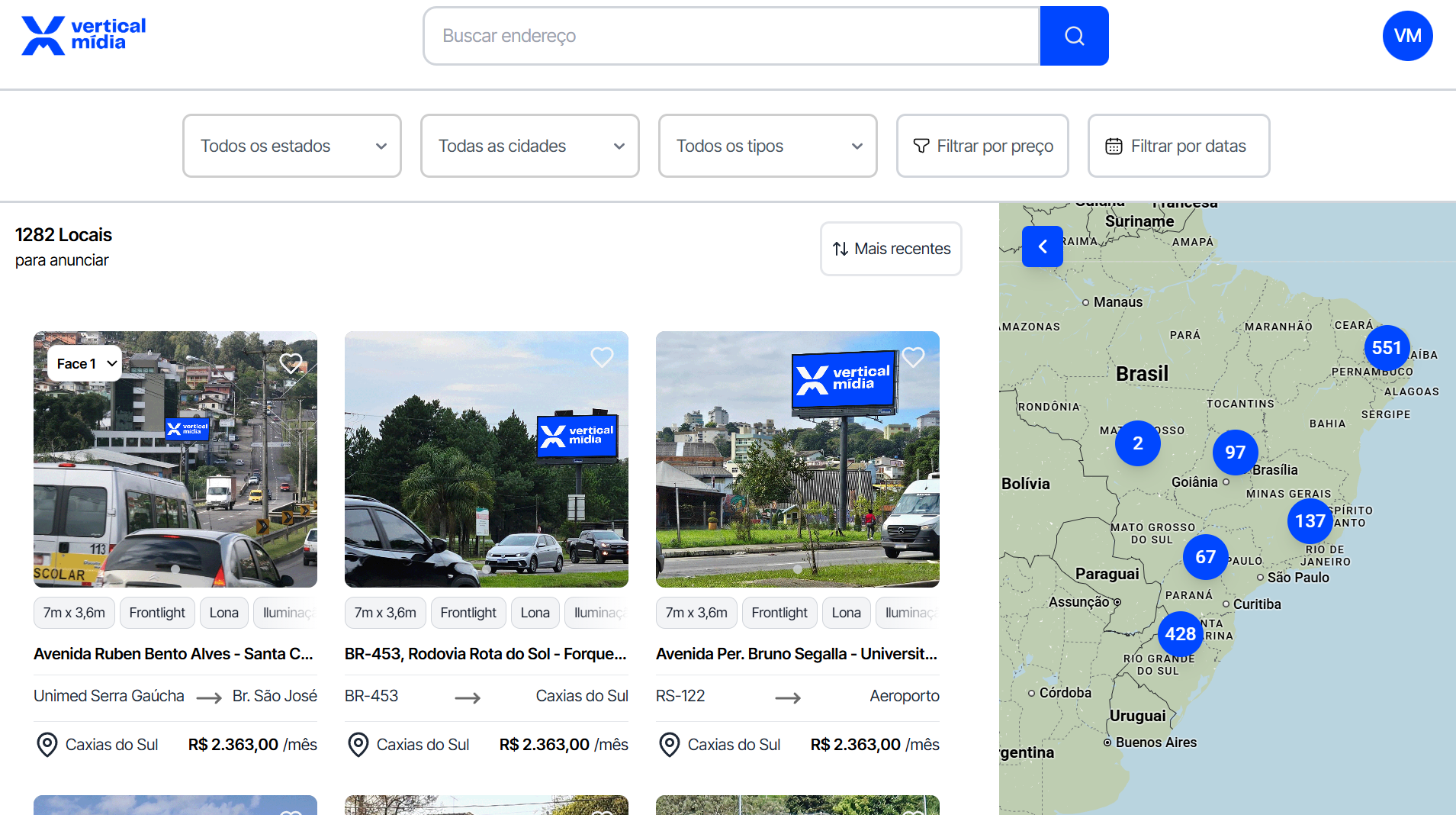 A Vertical Mídia organiza inventários de múltiplos veículos em uma única plataforma, permitindo visualizar, comparar e planejar campanhas de mídia externa com dados padronizados e apoio especializado.